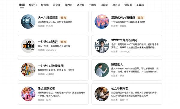 目前納米AI已上線10+類多智能體蜂群,涵蓋視頻制作、內(nèi)容創(chuàng)作、行業(yè)研究、電商帶貨、旅行規(guī)劃等多個場景,這些多智能體蜂群由每個行業(yè)的業(yè)務專家主導定制,更懂你,更實用。