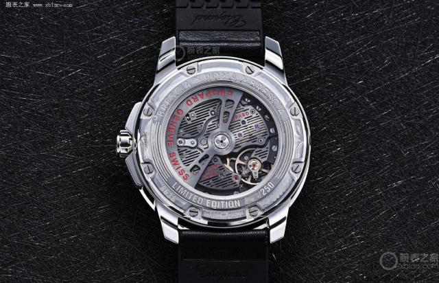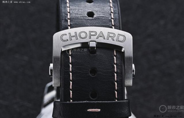 翻到腕表背面,通過藍寶石底蓋可以看到Chopard 01.02 - M型機芯。這枚自動上鏈機芯由品牌自主研發(fā),為適配腕表風格,夾板進行了PVD鍍色及鏤空處理。參數方面,Chopard 01.02 - M型機芯振頻28,800次/小時,擁有60小時動儲,并通過了瑞士官方天文臺認證(COSC)。