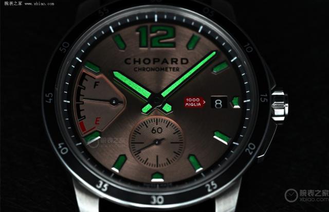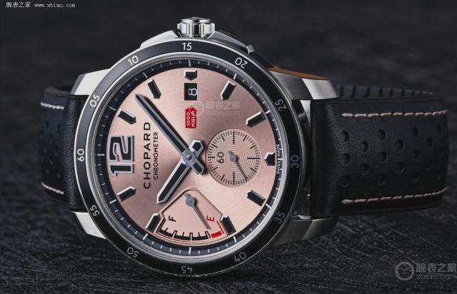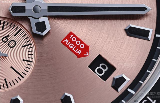 3點位的日期顯示窗以黑底白字呈現,提高了讀時清晰度。日歷窗左側印制的‘1000 MIGLIA’字樣紅色箭頭是該系列的特色,與動力儲存指針‘E’區(qū)域的紅色相互呼應。