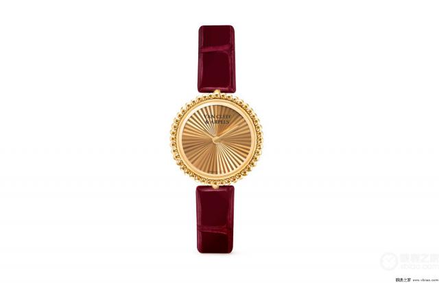 腕表點(diǎn)評(píng):梵克雅寶Perlée?系列用金珠元素裝飾腕表。自2008年問世以來(lái),一直以圓潤(rùn)飽滿的金質(zhì)圓珠賦予作品活潑形象。這款Perlée?系列腕表由黃金打造,表殼直徑23毫米。金珠表圈搭配黃金表盤,盤面上有璣鏤雕花裝飾,這種傳統(tǒng)雕刻工藝呈現(xiàn)出太陽(yáng)紋飾質(zhì)感的條紋,隨著佩戴者手腕運(yùn)動(dòng),會(huì)呈現(xiàn)光影交錯(cuò)的美感。黃金、金珠、璣鏤雕花層層疊加,整個(gè)表頭就像小太陽(yáng)!腕表配有可替換的紅色鱷魚皮表帶。預(yù)算充足的話,還能選同系列手鐲搭配,這份禮物絕對(duì)滿分!