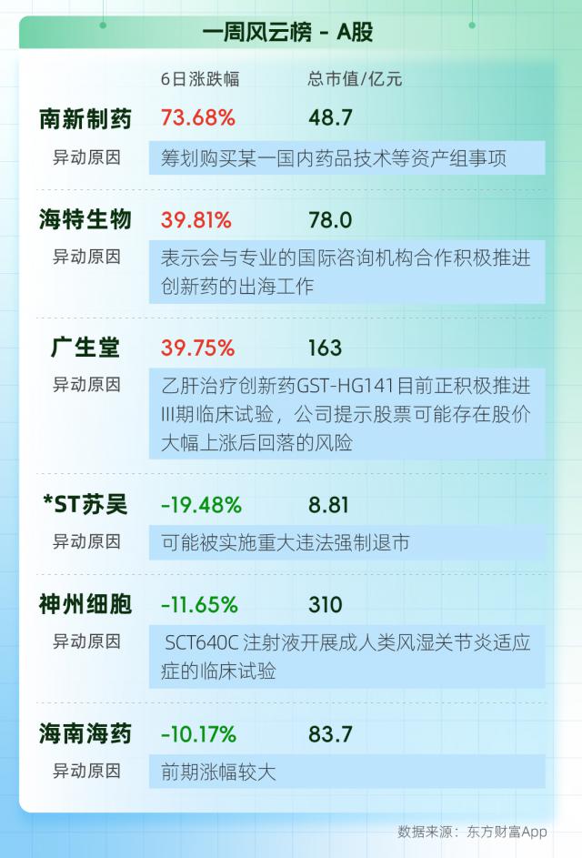 A股創(chuàng)新藥概念140只個股中,106只上漲,占比75.71%,近6個交易日漲幅超20%的有10家公司。本周港股114只個股中,76只上漲,占比66.67%。