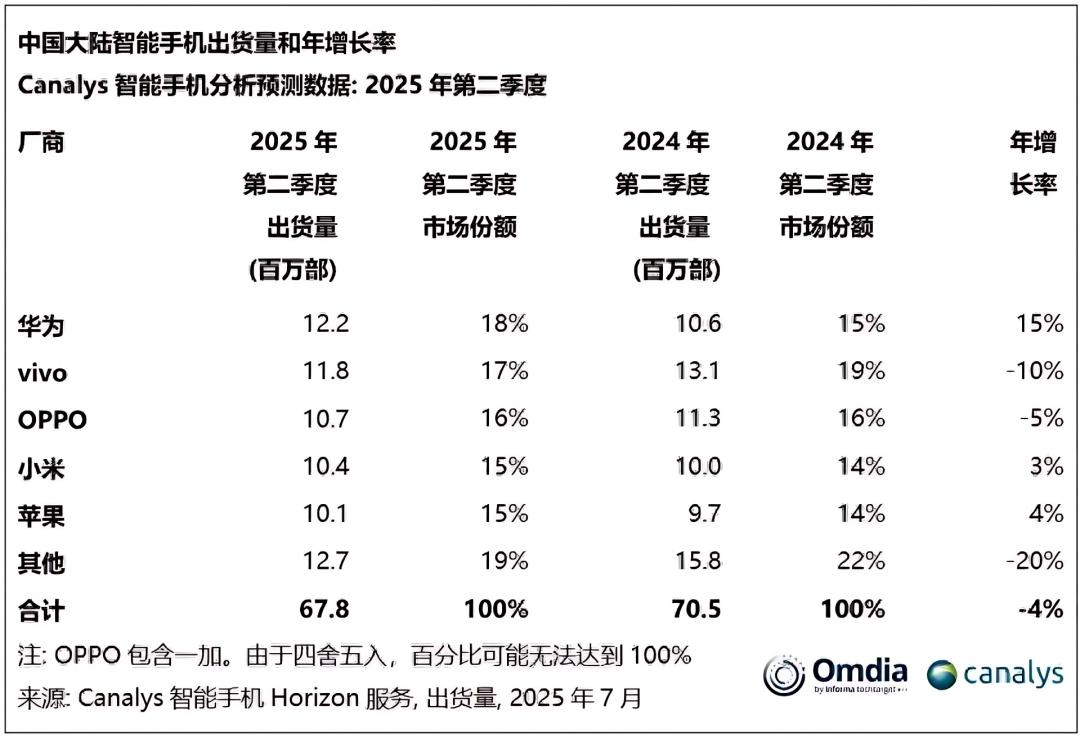 據(jù)Canalys 2025年Q2季度預(yù)測(cè)數(shù)據(jù),OPPO市場(chǎng)份額排第3,但出貨量較去年同期下降5%,與小米出貨量差距縮小。