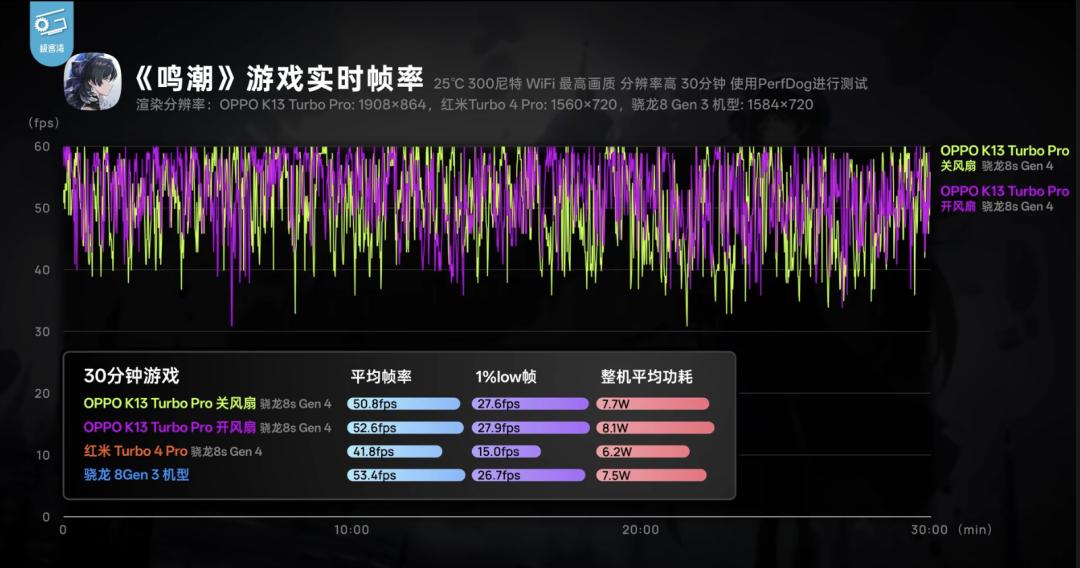 從測(cè)評(píng)來(lái)看,OPPO K13 Turbo Pro的L型背進(jìn)側(cè)出鰭片方案,相較于紅魔的貫通方案,風(fēng)量翻倍,體積占用減少約70%。在游戲表現(xiàn)上,以《鳴潮》為例,開(kāi)啟風(fēng)扇后,OPPO K13 Turbo Pro的游戲性能遠(yuǎn)超紅米Turbo 4 Pro。從性能和內(nèi)置方案來(lái)看,內(nèi)置風(fēng)扇主動(dòng)散熱似乎可行。