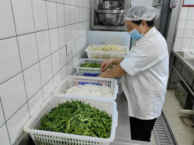 洗菜池前,師傅們認真清洗新鮮蔬菜,確保每片葉子都干凈無沙;案板旁,師傅們熟練地切配食材,刀起刀落間,食材被切成均勻形狀;角落里,還有師傅仔細檢查食材新鮮度和質(zhì)量,不放過任何細節(jié)。