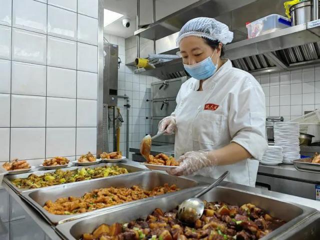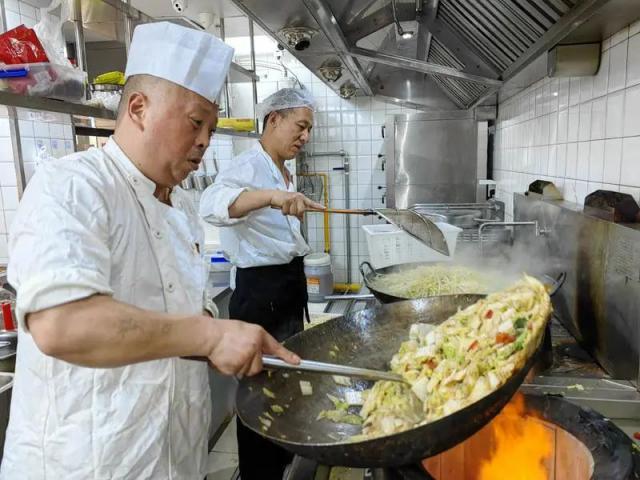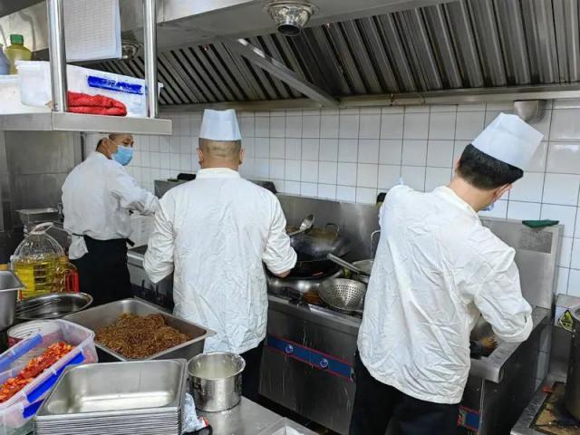 師傅們臉上滿是汗珠,后背早已被汗水濕透,但他們顧不上擦拭,專注于備菜工作。詹師傅邊喝水邊說:“我們早上8點就到,從清點食材、卸貨,到備菜,一刻都沒停過,接下來還要炒菜,一直忙到晚上,一天身上要出好幾身汗。”