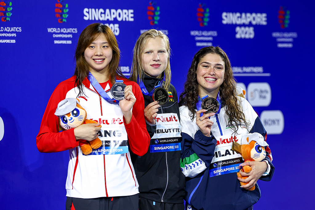 8月3日,2025年新加坡游泳世錦賽最后一個(gè)比賽日,上海運(yùn)動(dòng)員唐錢婷在女子50米蛙泳決賽獲銀牌,這是她在世錦賽的第二枚獎(jiǎng)牌。立陶宛選手梅盧蒂特奪冠,實(shí)現(xiàn)該項(xiàng)目世錦賽四連冠。