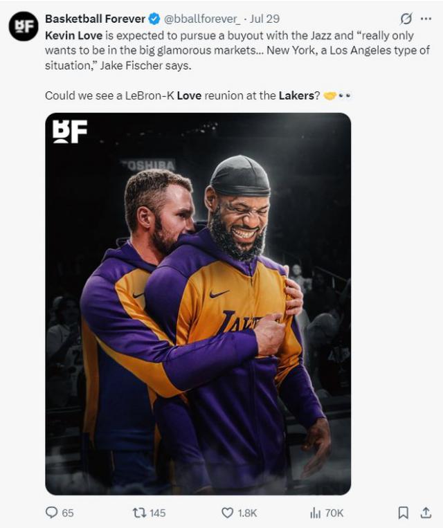 早在7月29號(hào),BR記者杰克 - 費(fèi)舍爾就透露樂(lè)福一直在探尋離開(kāi)爵士隊(duì)的途徑,他希望去大球市打球,如紐約、洛杉磯。當(dāng)時(shí)美媒BF還暢想36歲的樂(lè)福與40歲的勒布朗在LAL重聚的場(chǎng)景。