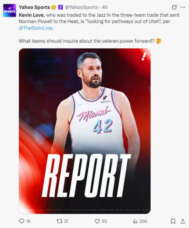 北京時(shí)間8月4日,據(jù)《紐約郵報(bào)》記者馬克 - 斯坦恩消息,五屆全明星凱文 - 樂(lè)福正探尋離開(kāi)猶他爵士隊(duì)的辦法,此前他在熱火、爵士、快船的三方交易中被送至爵士隊(duì)。