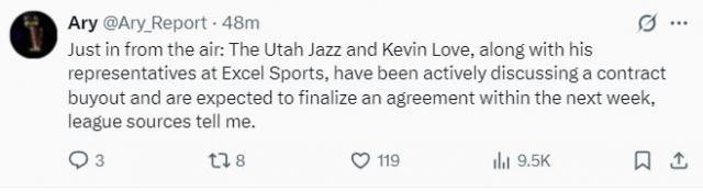 隨后美記Ary爆料,猶他爵士隊(duì)與凱文 - 樂(lè)福及其所在的Excel Sports經(jīng)紀(jì)公司一直在積極商討合同解約事宜,預(yù)計(jì)未來(lái)一周內(nèi)達(dá)成協(xié)議。