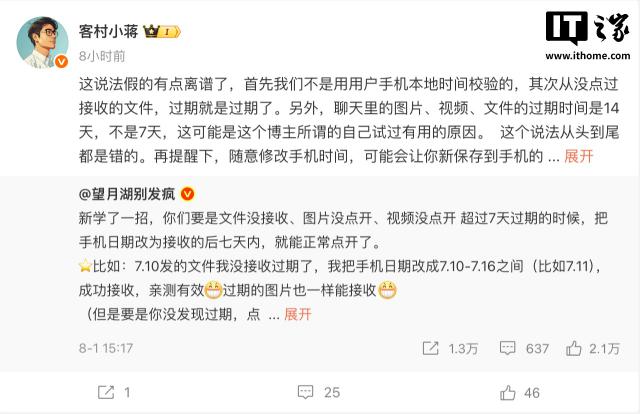 針對(duì)這一說法,微信員工@客村小蔣今天凌晨發(fā)文直言其“假得有點(diǎn)離譜”。首先,微信不是用用戶手機(jī)本地時(shí)間校驗(yàn)的;其次,從沒點(diǎn)過接收的文件,過期就是過期了。另外,聊天里的圖片、視頻、文件的過期時(shí)間是14天,不是7天,這或許就是該博主所謂自己試過有用的原因。