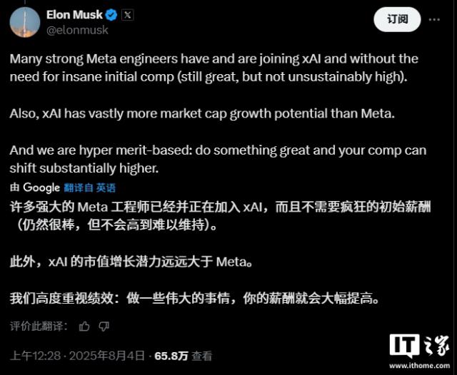 IT之家8月4日消息,埃隆?馬斯克透露,盡管xAI一開始給出的薪酬待遇并非高得“離譜”,但Meta旗下的多名高級工程師正紛紛轉投他的人工智能公司xAI。馬斯克還表示,從長遠來看,xAI的估值有希望超過Meta。并且,他強調(diào)xAI向來有為頂尖人才大幅加薪的傳統(tǒng)。