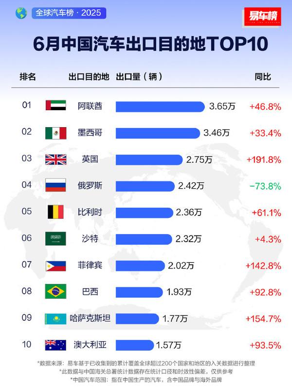 【CNMO 科技消息】近日,有機(jī)構(gòu)依據(jù)已收集的累計(jì)覆蓋全球超200個(gè)國家和地區(qū)的入關(guān)數(shù)據(jù),整理出2025年6月中國汽車出口目的地TOP10: