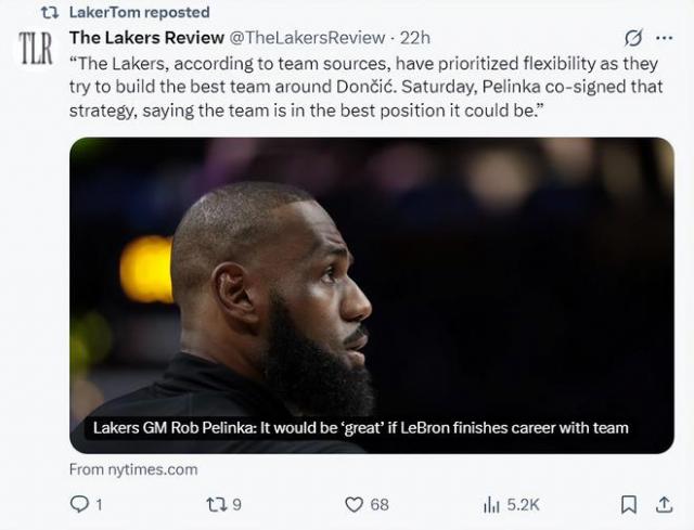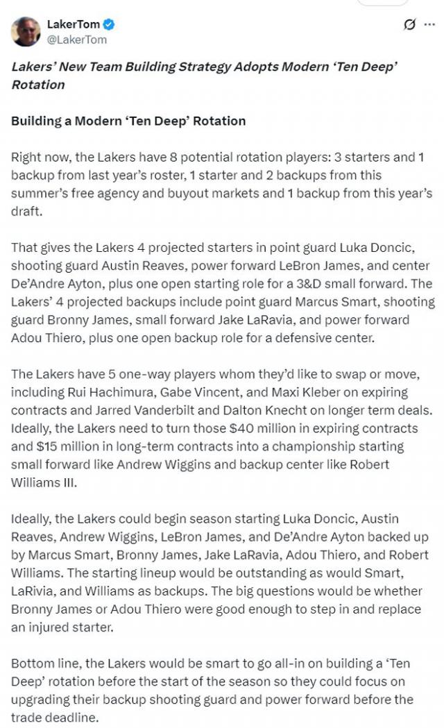 顯然,湖媒Laker Tom并不認(rèn)同佩林卡的觀點(diǎn)。他在社媒上發(fā)布長文駁斥了佩林卡,還撰寫了一篇名為《湖人新團(tuán)隊(duì)建設(shè)應(yīng)該用十人輪換來取代陳舊的三巨頭模式》的文章。