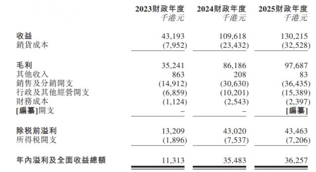 在2023財政年度、2024財政年度、2025財政年度(往績記錄期),正品控股實現(xiàn)的收益分別約為0.43億港元、1.10億港元、1.30億港元;年內(nèi)溢利及全面收益總額分別約為1131.3萬港元、3548.3萬港元、3625.7萬港元。