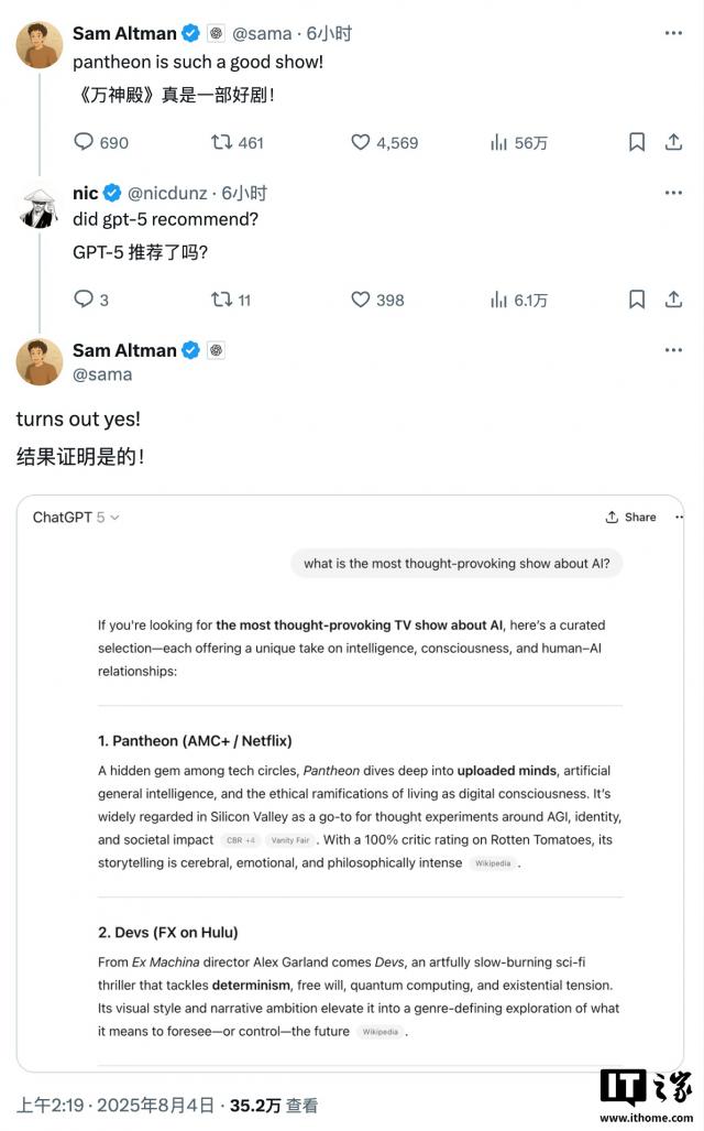 奧爾特曼在推文中推薦了科幻動畫《Pantheon》,這部在科技圈頗具人氣的劇集聚焦通用人工智能等議題。評論區(qū)有用戶追問:“GPT - 5也推薦這部劇嗎?”奧爾特曼隨即貼出一張聊天記錄截圖回應(yīng):“結(jié)果是會!”