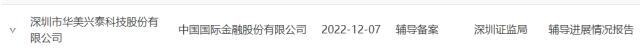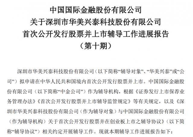 瑞財(cái)經(jīng) 王敏 7月31日,深圳市華美興泰科技股份有限公司(以下簡(jiǎn)稱“華美興泰”)披露關(guān)于首次公開發(fā)行股票并上市輔導(dǎo)工作進(jìn)展報(bào)告(第十期),輔導(dǎo)機(jī)構(gòu)為中金公司。