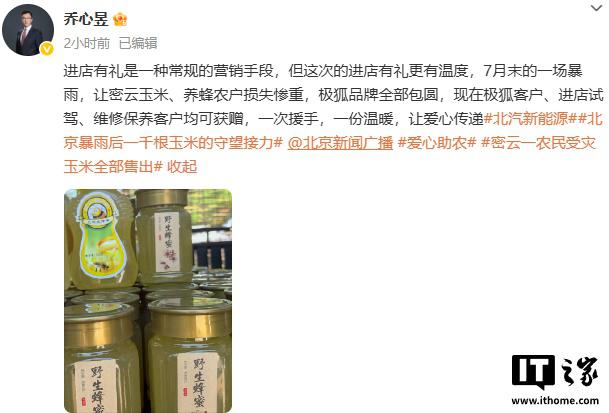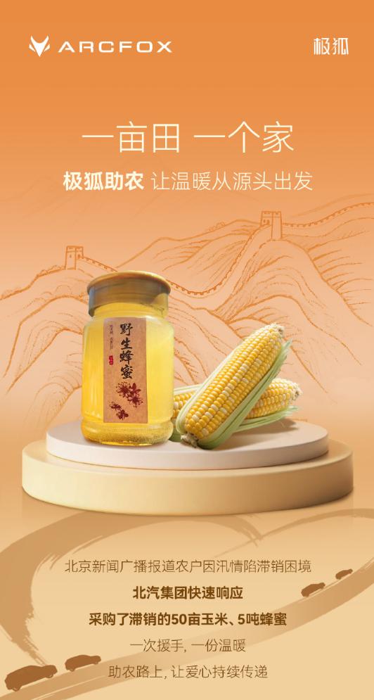 北汽新能源極狐品牌用戶運營中心副總經(jīng)理喬心昱發(fā)文表示:“進店有禮是常見的營銷手段,但這次的進店有禮更具溫度。7月末的一場暴雨,讓密云玉米和養(yǎng)蜂農(nóng)戶損失慘重,極狐品牌將這些滯銷農(nóng)產(chǎn)品全部包下。現(xiàn)在極狐客戶、進店試駕以及維修保養(yǎng)客戶均可獲贈,一次援手,一份溫暖,讓愛心傳遞?!?/p>