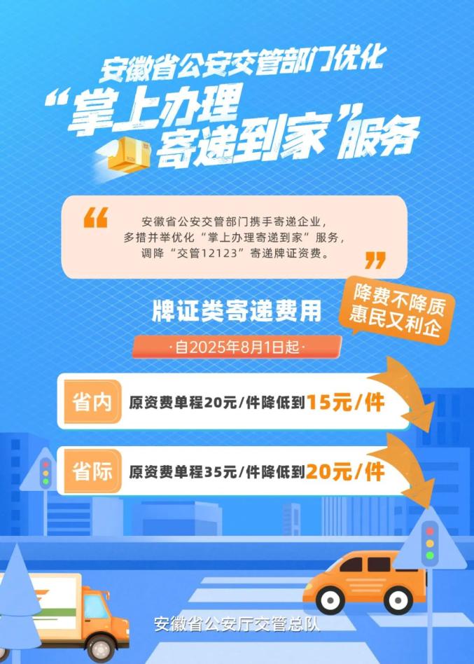 自2025年8月1日起,安徽省牌證類寄遞費用迎來下調(diào)。為持續(xù)深化公安“放管服”改革,加大惠民利企力度,安徽省公安廳交管總隊攜手寄遞企業(yè),優(yōu)化“掌上辦理 - 寄遞到家”服務(wù)。此次調(diào)整將省內(nèi)牌證類寄遞費用從每件20元降至15元,省際則從每件35元降至20元。該降費措施實施后,預(yù)計每年可為群眾減少相關(guān)費用支出800余萬元。