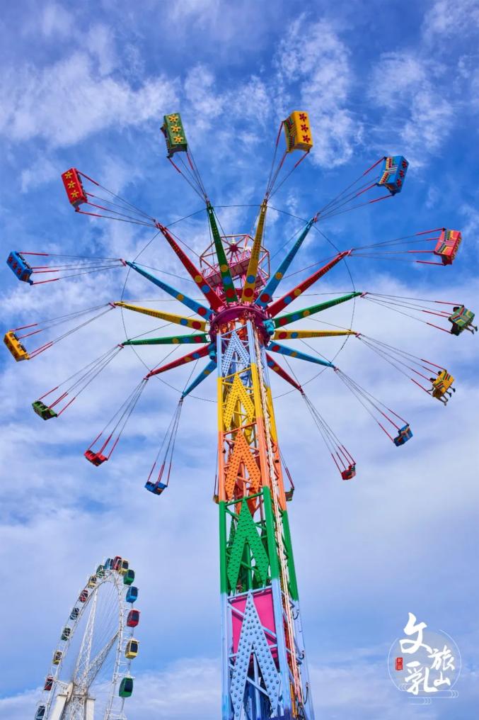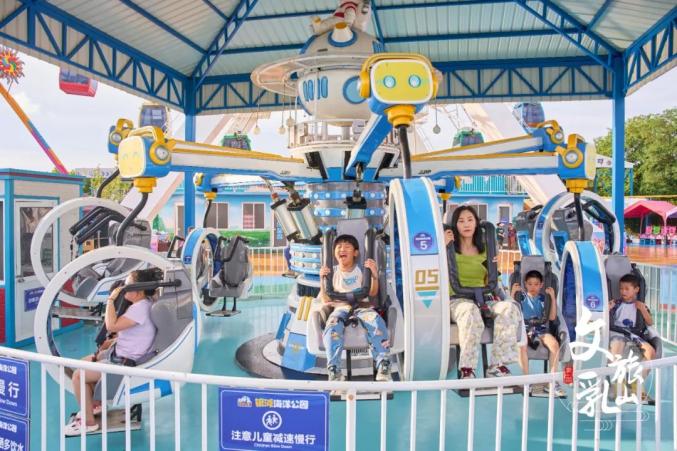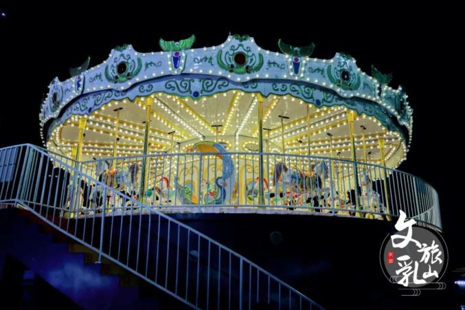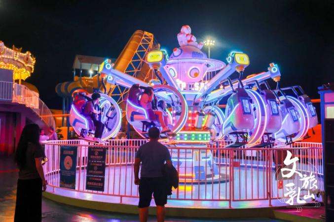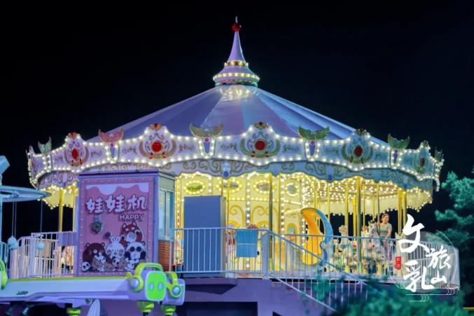 旋轉(zhuǎn)木馬亮起童話燈光,天空在落日余暉下變成橘子海。彩燈、音樂和孩子們的歡笑交織,繪成一幅美麗畫卷。
