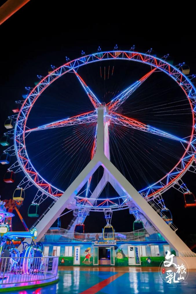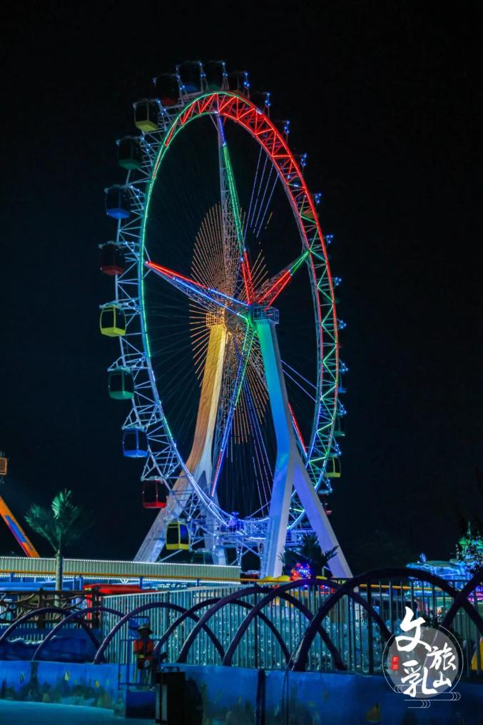 夜幕降臨,華燈初上,在摩天輪上俯瞰海景,霓虹車廂升到頂端,整片銀灘夜景盡收眼底。