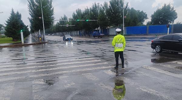 在易堵路口和積水路段,執(zhí)勤交警全力疏導(dǎo)交通,提醒過(guò)往車輛減速慢行、保持安全車距,確保道路暢通。