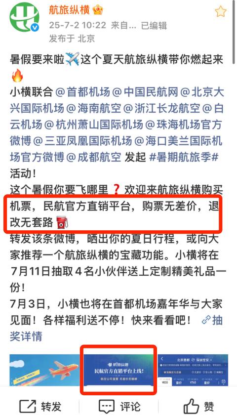 據(jù)梳理,航旅縱橫有關(guān)“民航官方直銷平臺”的提法首次出現(xiàn)在7月2日,粉絲量超60萬的航旅縱橫官方微博借暑期活動強調(diào)其作為民航官方直銷平臺,“購票無差價,退改無套路”。之后,該標簽頻繁出現(xiàn)在其微博內(nèi)容中。