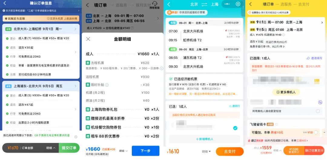 有意思報告在8月2日午間以9月1日 - 5日北京往返上海行程為例,選取最早時間的東航、國航兩趟航班,在數(shù)次“婉拒”平臺提供的退票、改簽、保險等服務(wù)選項后進行“裸價”對比,航旅縱橫比支付價格最高的某平臺價格還高出10元。