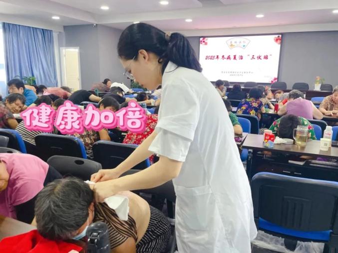 三伏貼是中醫(yī)“冬病夏治”理念的經(jīng)典療法。在盛夏陽氣最旺盛時,將特制中藥貼敷在人體穴位上,可起到疏通經(jīng)絡(luò)、調(diào)和氣血、改善虛寒體質(zhì)的作用。為減少居民等待時間,醫(yī)護團隊清晨7點就全員到崗準備。藥粉按精確比例調(diào)配好,敷料分袋封裝妥當,穴位圖張貼在顯眼位置,座位也依據(jù)敷貼流程精心布局。盡管室外暑氣漸重,室內(nèi)卻井然有序:簽到臺的醫(yī)務(wù)人員快速準確核對居民信息,負責(zé)敷貼的中醫(yī)醫(yī)師俯身專注為居民找準穴位,手法輕柔精準,還不時叮囑:“這個位置一定要貼緊,這樣才能把藥效牢牢鎖住?!?/p>