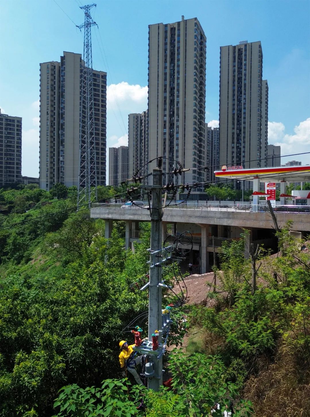 7月29日,在沙坪壩區(qū)石井坡街道,國(guó)網(wǎng)重慶市區(qū)供電公司的工作人員頭頂烈日開展帶電作業(yè)。