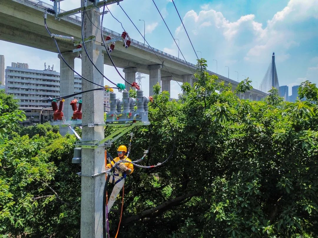 當(dāng)天,在沙坪壩區(qū)石井坡街道,工作人員在對(duì)10千伏線路進(jìn)行電纜搭頭。