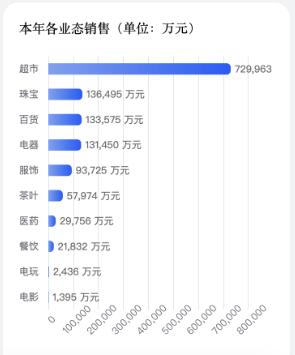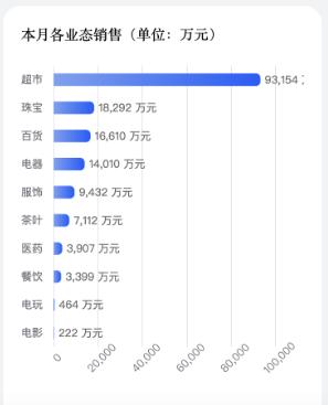 從各業(yè)態(tài)銷售情況來看,7月份,胖東來超市、珠寶、百貨、電器這四大業(yè)態(tài)單月銷售額均超過億元,分別為9.32億元、1.83億元、1.66億元和1.40億元,合計(jì)占當(dāng)月總銷售額的85.27%。服飾、茶葉等生活消費(fèi)類業(yè)態(tài)緊隨其后,銷售額分別為0.94億元、0.74億元。