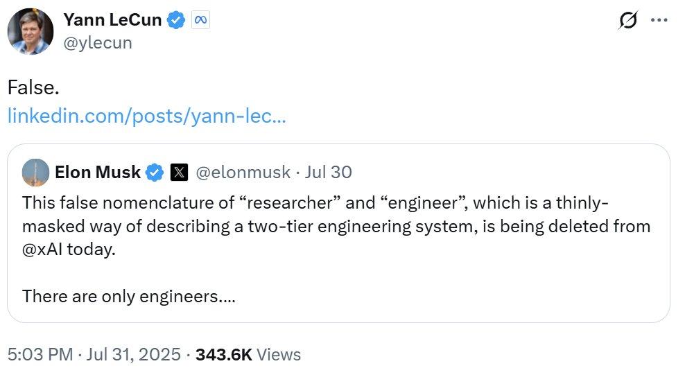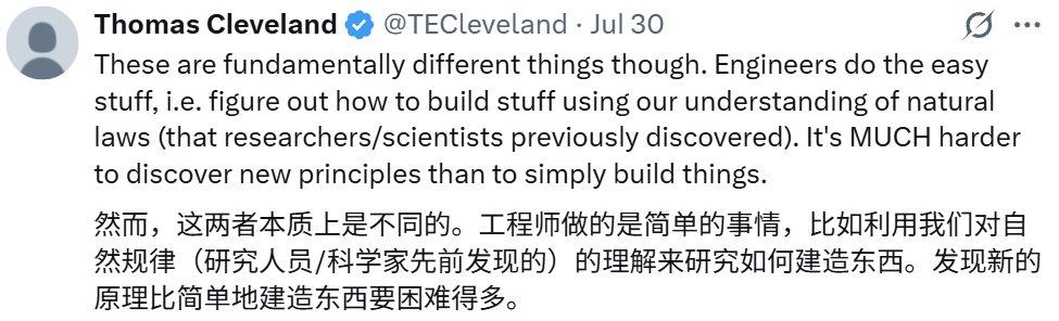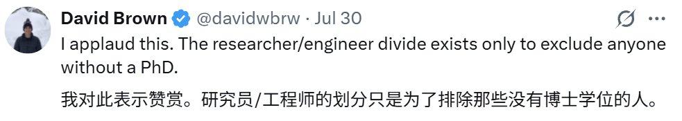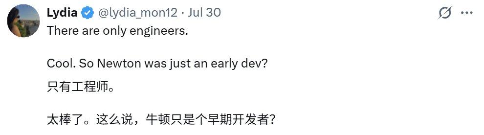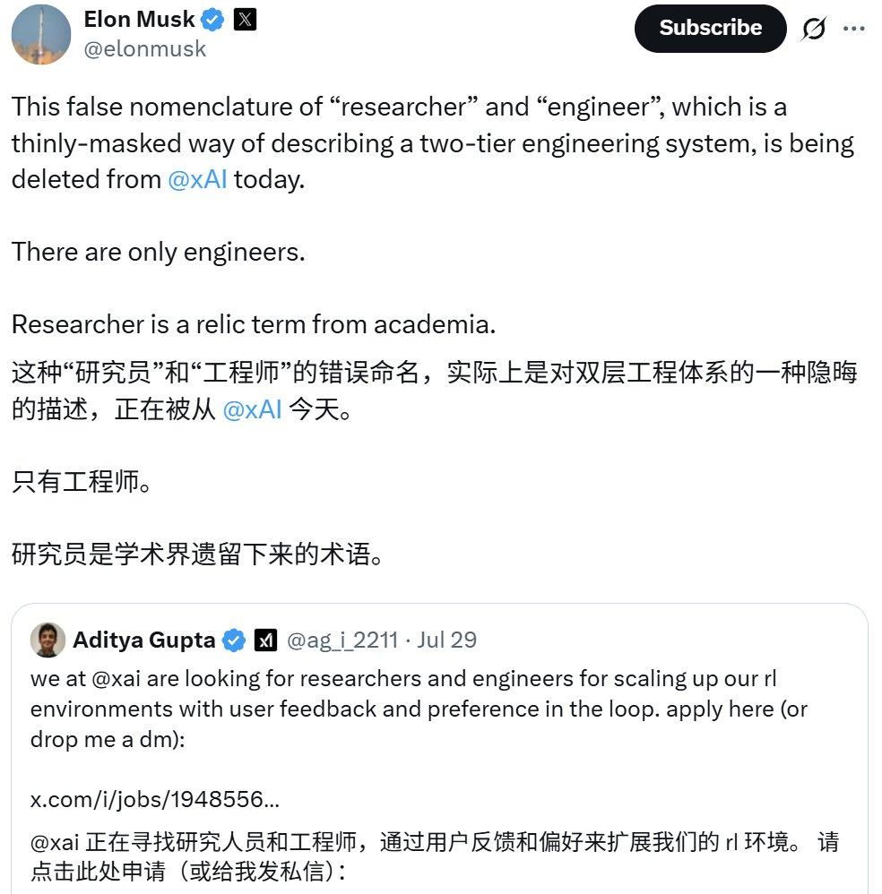 在轉(zhuǎn)發(fā)xAI自家員工的招聘推文評論中,馬斯克稱區(qū)分「研究員」和「工程師」是錯誤的命名,實際上是對雙層工程體系的一種隱晦表述。