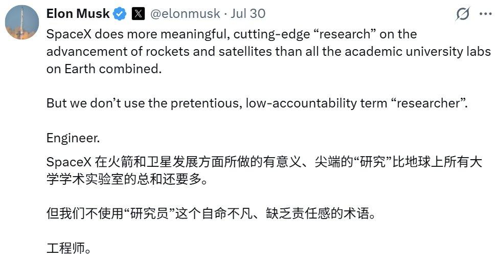 在這條推文下方,馬斯克略帶譏諷地說:「SpaceX在火箭和衛(wèi)星發(fā)展方面所做的有意義、前沿的『研究』比地球上所有大學學術實驗室的總和還要多。但我們不用『研究員』這個自命不凡、缺乏責任感的術語,我們用的是工程師?!?/p>