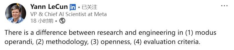 在鏈接的領英發(fā)帖中,LeCun從四個方面詳細闡述了研究與工程的差異:運作方式、方法論、開放性和評估標準。