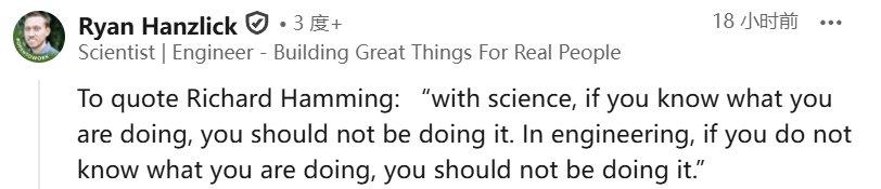 或許正如圖靈獎得主、數(shù)學家理查德?漢明所說:「研究科學時,若你知道自己在做什么,就不該去做。做工程開發(fā)時,若你不知道自己在做什么,就不該去做?!?/p>