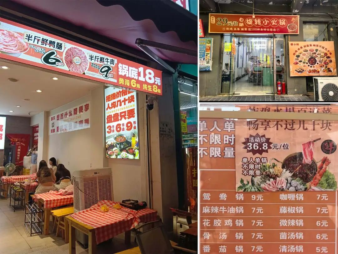 在價(jià)格戰(zhàn)的影響下,小火鍋定價(jià)陷入混亂。全國(guó)出現(xiàn)不少9.9元鍋底 + 調(diào)料的門(mén)店,還有“鍋底免費(fèi),百種菜品都是1元”的品牌。這使得小火鍋利潤(rùn)空間進(jìn)一步壓縮。美團(tuán)數(shù)據(jù)顯示,2024年火鍋午市訂單量同比暴漲162%,客單價(jià)卻下降23%。