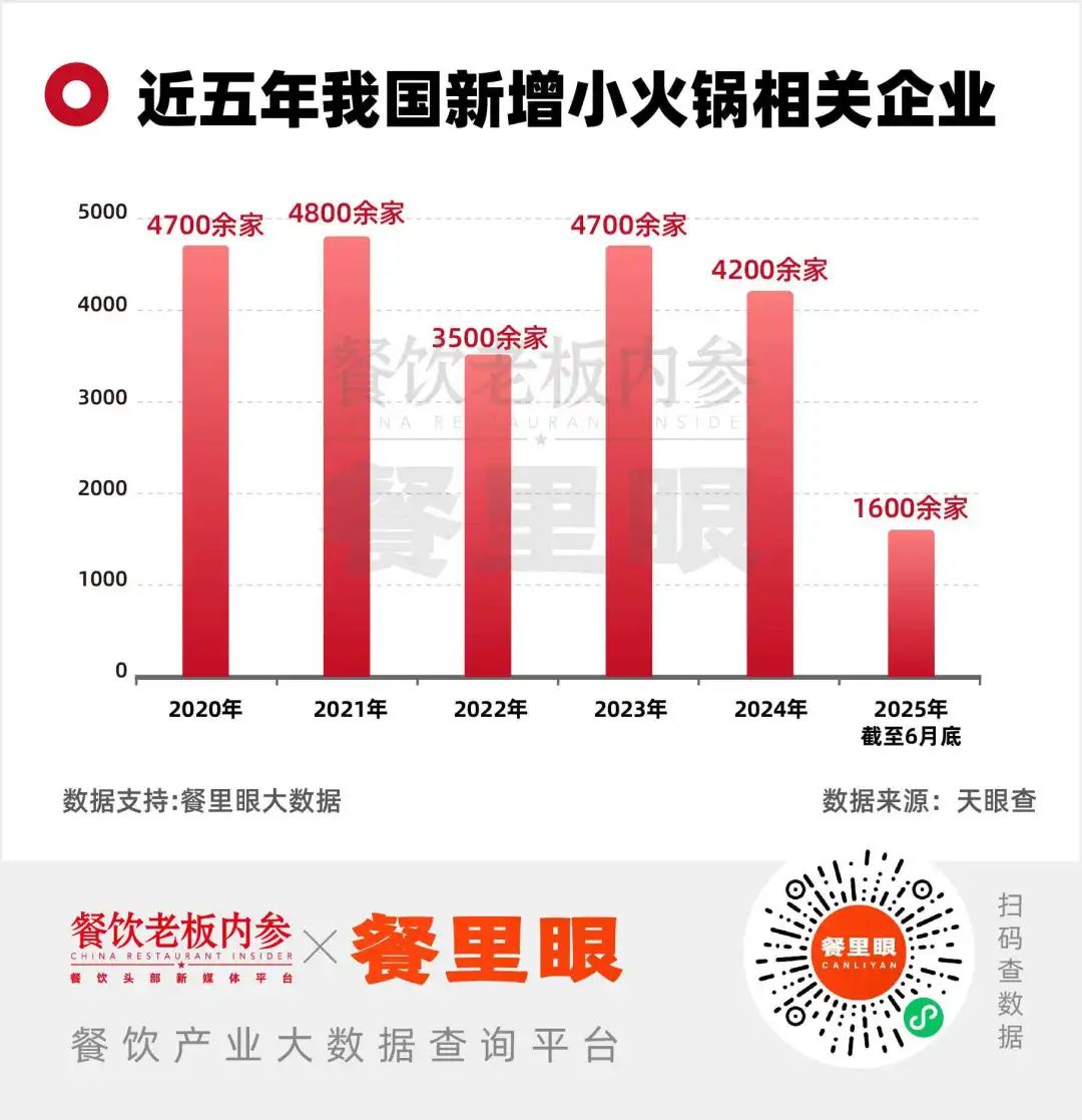 天眼查數(shù)據(jù)顯示,近五年我國(guó)新增小火鍋相關(guān)企業(yè)2.3萬(wàn)余家。2020 - 2024年分別新增4700余家、4800余家、3500余家、4700余家、4200余家,2025年截至6月新增1600余家。2022年短暫回落后,2023、2024年迎來(lái)開(kāi)店熱潮。