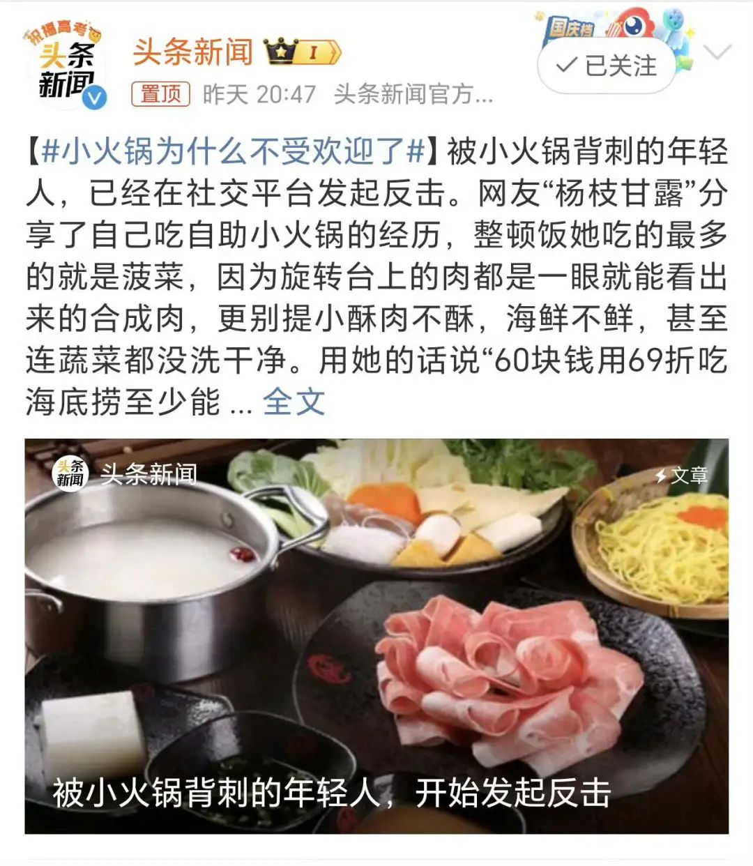 2024年盛夏,#小火鍋為什么不受歡迎了#登上微博熱搜,社交平臺(tái)上也有“小火鍋臟不臟”的討論。網(wǎng)友戲稱(chēng)“什么自助小火鍋,不如叫科技小火鍋”。在微博投票中,近一半投票者認(rèn)為“食材品質(zhì)下降”是主要原因,其次是“價(jià)格過(guò)高”“口味單一”。