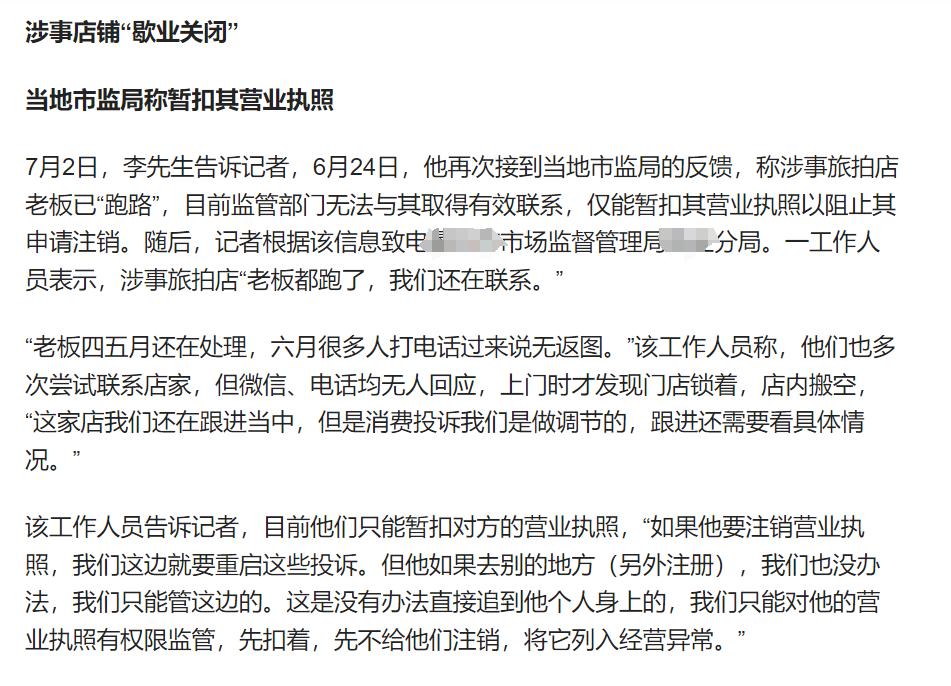 監(jiān)管方也缺乏有效的處理辦法。在當(dāng)前市場環(huán)境下,這種糟糕的體驗可能會成為常態(tài),更有業(yè)者斷言,“80% - 90%來旅拍的消費(fèi)者都會被坑”。隨著旅游旺季結(jié)束,新一輪旅拍閉店潮、跑路潮即將來臨。