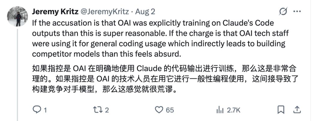此事在社交網(wǎng)站引發(fā)網(wǎng)友熱議。有網(wǎng)友從技術(shù)角度表示,如果指控OpenAI明確用Claude的代碼輸出進(jìn)行訓(xùn)練,那合理;若指控是技術(shù)人員一般性編程使用間接導(dǎo)致構(gòu)建競(jìng)爭(zhēng)對(duì)手模型,就很荒謬。