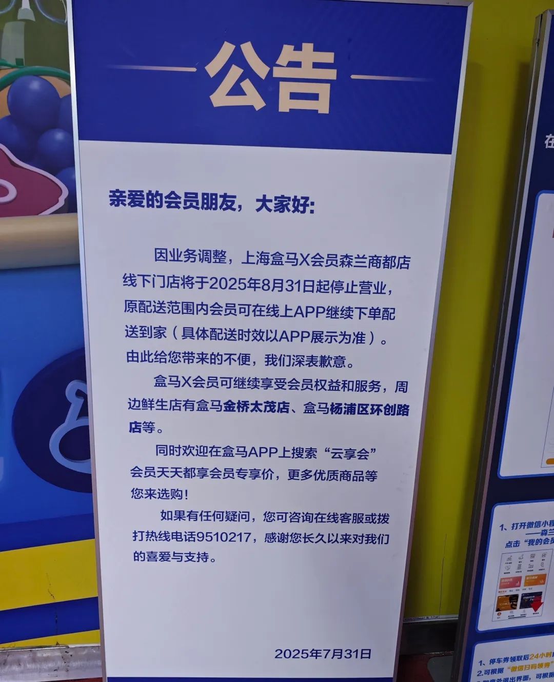 7月31日,上海盒馬X會員森蘭商都店發(fā)布公告稱,因業(yè)務調(diào)整,線下門店將于2025年8月31日起停止營業(yè),原配送范圍內(nèi)會員可在線上盒馬APP繼續(xù)下單享受配送到家服務。
