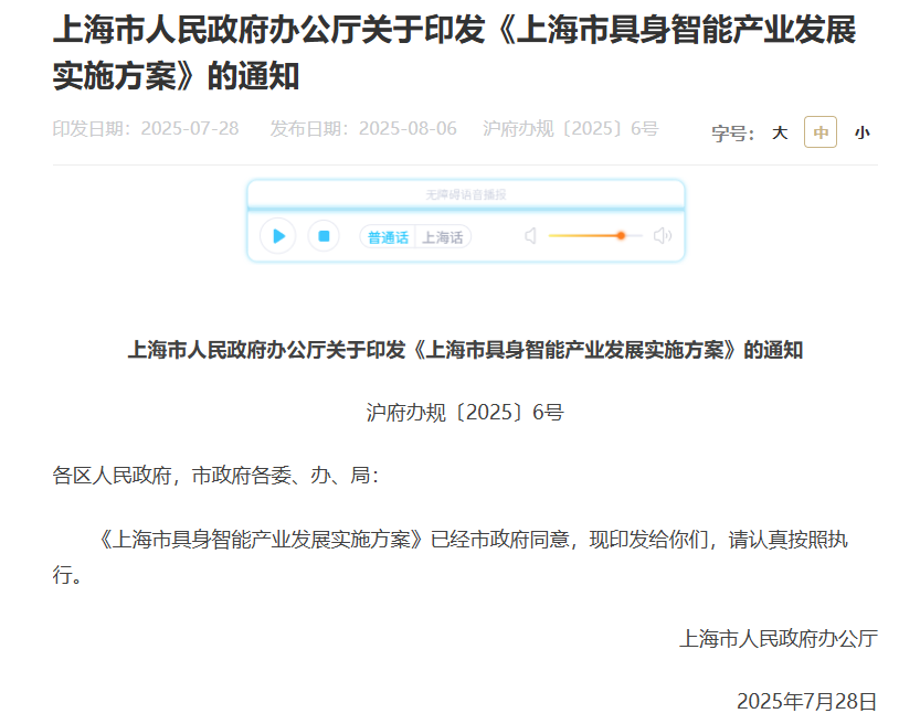 8月6日,上海市人民政府官網(wǎng)顯示,上海市人民政府辦公廳印發(fā)《上海市具身智能產(chǎn)業(yè)發(fā)展實(shí)施方案》(以下簡(jiǎn)稱(chēng)《實(shí)施方案》)。該文件自2025年7月28日起施行,有效期至2028年7月27日。