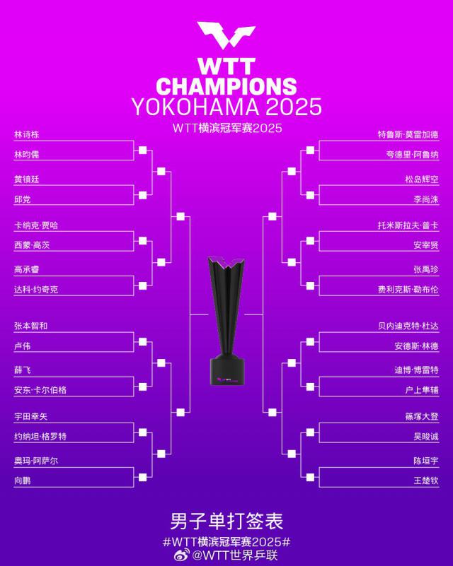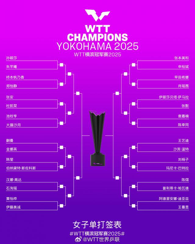2025年8月5日,據(jù)央視新聞消息,WTT橫濱冠軍賽單打簽表公布,孫穎莎首場將對陣韓國選手朱芊曦。2025年WTT橫濱冠軍賽于8月7日至11日在日本橫濱文化體育館舉行,讓我們一起為國乒加油!