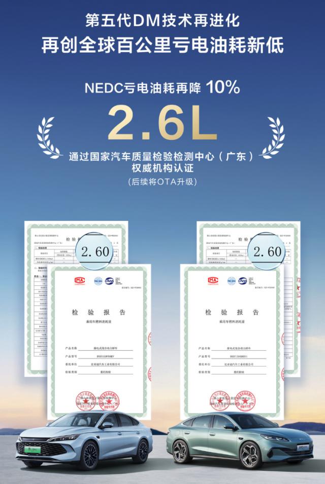 就在今天,比亞迪官宣第五代 DM 技術(shù)再次進化。油耗在之前的基礎(chǔ)上又降低了 10%,NEDC 虧電油耗降到了 2.6L,再創(chuàng)歷史新低。