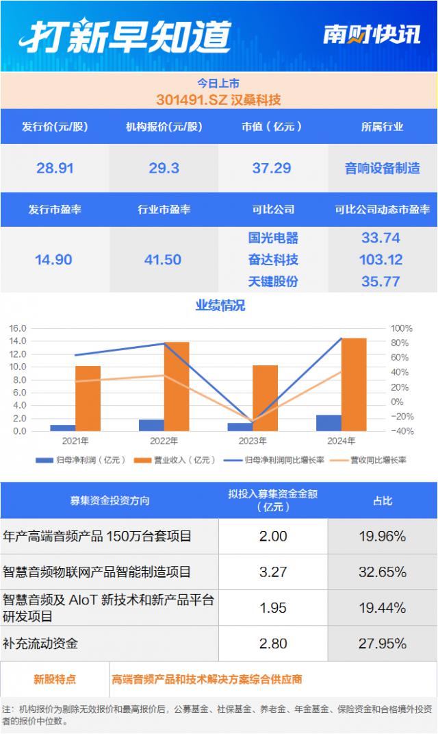 8月6日,漢桑科技 (301491.SZ) 在創(chuàng)業(yè)板成功上市。該企業(yè)是專注于高端音頻產(chǎn)品及技術(shù)解決方案的綜合供應(yīng)商,擁有從流媒體模組到音頻終端產(chǎn)品,再到邊緣計算和云平臺的完整技術(shù)與產(chǎn)品鏈。