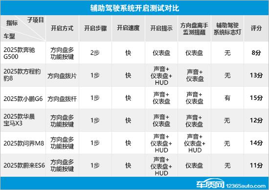 橫向?qū)Ρ劝l(fā)現(xiàn),除2025款方程豹豹8用方向盤撥片、2025款小鵬G6用方向盤撥桿開啟外,其余車型都用方向盤多功能按鍵開啟。只有2025款奔馳G500開啟需2步,日常使用較繁瑣。方程豹豹8、2025款問界M8和2025款蔚來ES6不僅儀表盤有圖標(biāo)提示,還有聲音和HUD抬頭顯示提示,讓駕駛員更清楚輔助駕駛狀態(tài)。6款車都有方向盤離手監(jiān)測提醒功能,問界M8有三種提醒方式,表現(xiàn)較好。小鵬G6是唯一配備輔助駕駛系統(tǒng)標(biāo)志燈的車型,能給其他道路參與者明顯提示,值得稱贊。