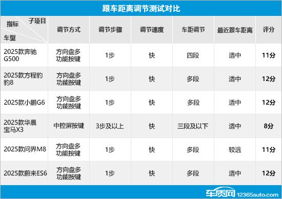 跟車距離項(xiàng)目對比中,方程豹豹8、小鵬G6和蔚來ES6表現(xiàn)較好,調(diào)節(jié)方式簡便,支持多段車距調(diào)節(jié),跟車距離把控合理,能保證安全并避免其他車輛加塞。奔馳G500和問界M8操作便利性值得肯定,但前者車距調(diào)節(jié)段落少、后者跟車距離遠(yuǎn),都有減分情況。2025款華晨寶馬X3調(diào)節(jié)方式復(fù)雜,且是唯一僅支持三段及以下車距調(diào)節(jié)的車型,本環(huán)節(jié)成績墊底,有待優(yōu)化。