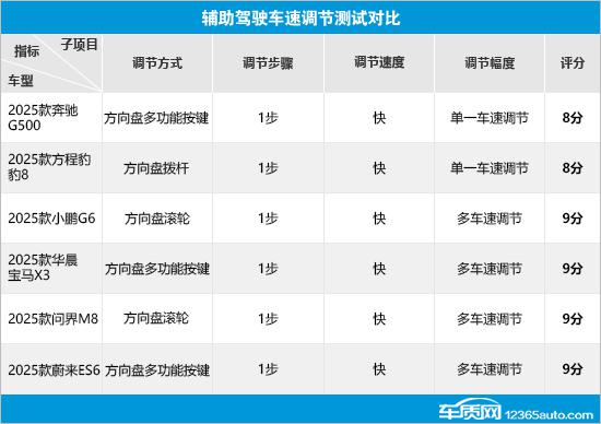在車速調(diào)節(jié)項(xiàng)目中,6款車整體表現(xiàn)符合預(yù)期。調(diào)節(jié)方式有差異,但調(diào)節(jié)步驟和速度表現(xiàn)一致。不過,奔馳G500和方程豹豹8不支持多車速調(diào)節(jié),導(dǎo)致失分。