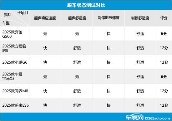 跟車狀態(tài)測試中,方程豹豹8、小鵬G6、問界M8和蔚來ES6獲滿分,表現(xiàn)出色。奔馳G500和寶馬X3僅得6分,雙雙墊底,原因是不支持自動跟車起步功能,起步響應(yīng)速度和舒適度兩項(xiàng)未得分。