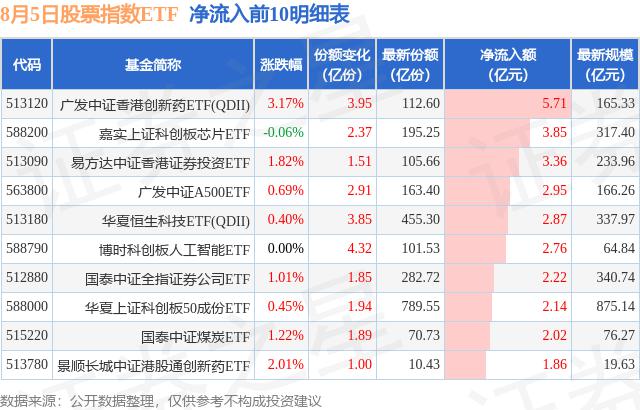 當(dāng)日有144只股票指數(shù)ETF基金出現(xiàn)資金凈流入,其中凈流入排名首位的是廣發(fā)中證香港創(chuàng)新藥ETF (QDII)(513120),其份額增加了3.95億份,凈流入額達(dá)到5.71億元。